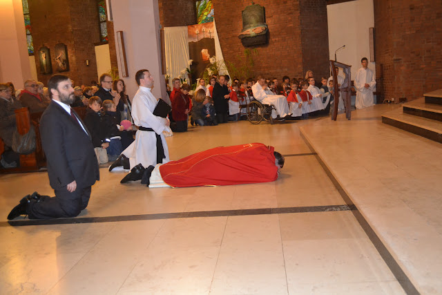 Zgodnie z tradycją w Wielki Piątek Kościół nie sprawuje Mszy św. W tym dniu pochylamy się nad tajemnicą Krzyża. Centrum stanowi Liturgia Męki Pańskiej. Składa się z następujących elementów: liturgii Słowa Bożego z opisem Męki Pańskiej wg św. Jana, z adoracji Krzyża oraz Komunii św. Na zakończenie liturgii następuje procesja z Najświętszym Sakramentem do ołtarza wystawienia w grobie. Fotorelacja z liturgii.